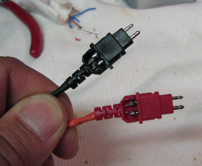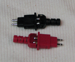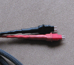 This is what the plugs should look like after “tinning” them with solder. You want just a little bit of solder coming out of each cup, next you’ll want to do the same to your wires, so that all you have to do next is apply heat to each terminal, and insert the wire in each cup. Don’t forget to slide the shrink tubing down the wires at this time. You’re going to need one piece of 3/16″ (longest piece), 1/4″ (middle length piece) and a 3/8″ piece which will cover the open side of the soldered plugs.