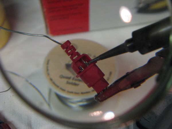 Using a “helping hands” accessory to hold the plugs in place, fill each terminal cup with Solder. You want to run your iron at about 30w and go in for no more than 2 seconds, otherwise you will melt the plug or distort it (using too little heat will do this, so you want to apply enough heat quickly enough to melt the solder but not have it there long enough to melt the plastic).